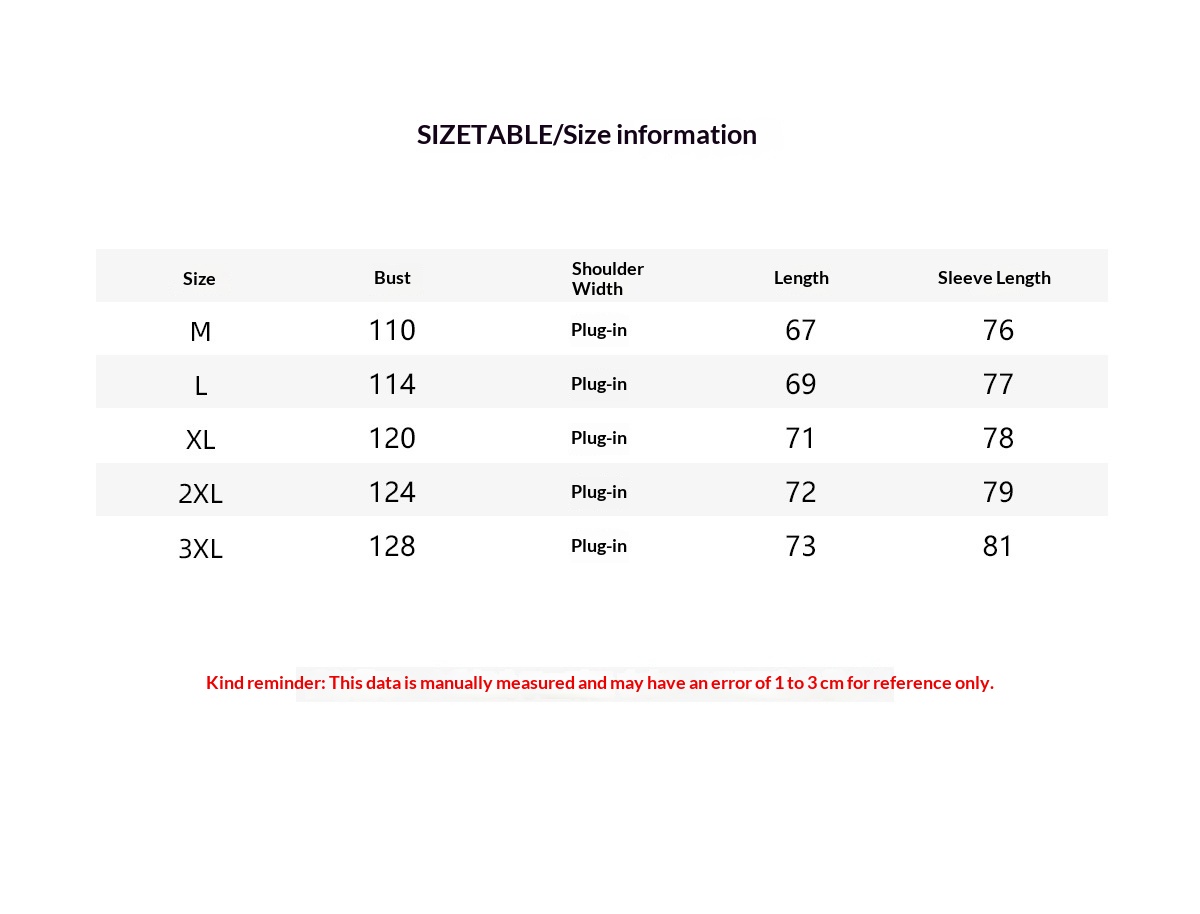1. Asiatische Größen fallen 1 bis 2 Nummern kleiner aus als europäische und amerikanische. Wählen Sie die größere Größe, wenn Ihre Größe zwischen zwei liegt. Bitte beachten Sie, dass es aufgrund manueller Messung zu Abweichungen von 2–3 cm kommen kann. 2. Bitte überprüfen Sie die Größentabelle sorgfältig, bevor Sie den Artikel kaufen. Wenn Sie sich bei der Größenwahl unsicher sind, kontaktieren Sie bitte unseren Kundenservice. 3. Wie Sie wissen, werden Farben auf verschiedenen Computern unterschiedlich dargestellt. Die Farbe des tatsächlichen Artikels kann daher geringfügig von den Abbildungen abweichen.