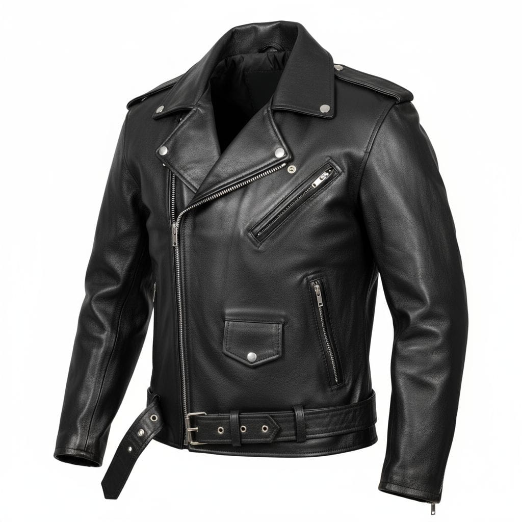 A sleek and timeless black leather biker jacket crafted from smooth, high-quality leather. Featuring an asymmetrical front zipper, wide notch lapels with snap details, multiple zippered pockets, and a belted waist for an adjustable fit. The structured silhouette and polished metal hardware give it a bold, edgy look—perfect for casual wear or adding a rugged touch to any outfit.